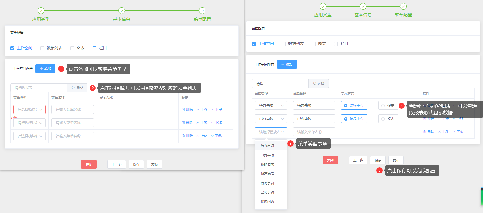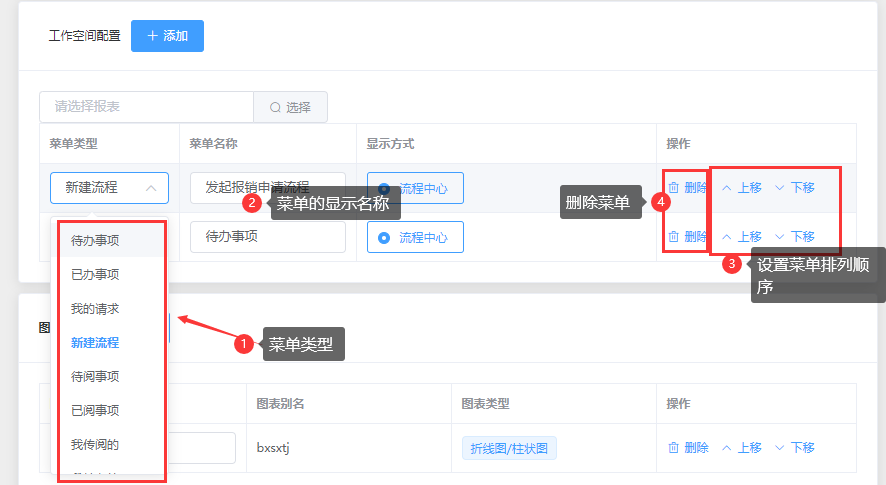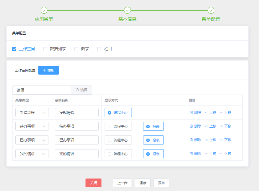 配置流程模块的菜单类型及显示方式(未选择数据报表时,显示方式只有“流程中心”);