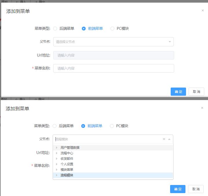 1、选择后端/前端菜单后,父节点会对应只能选择后端/前端的菜单;