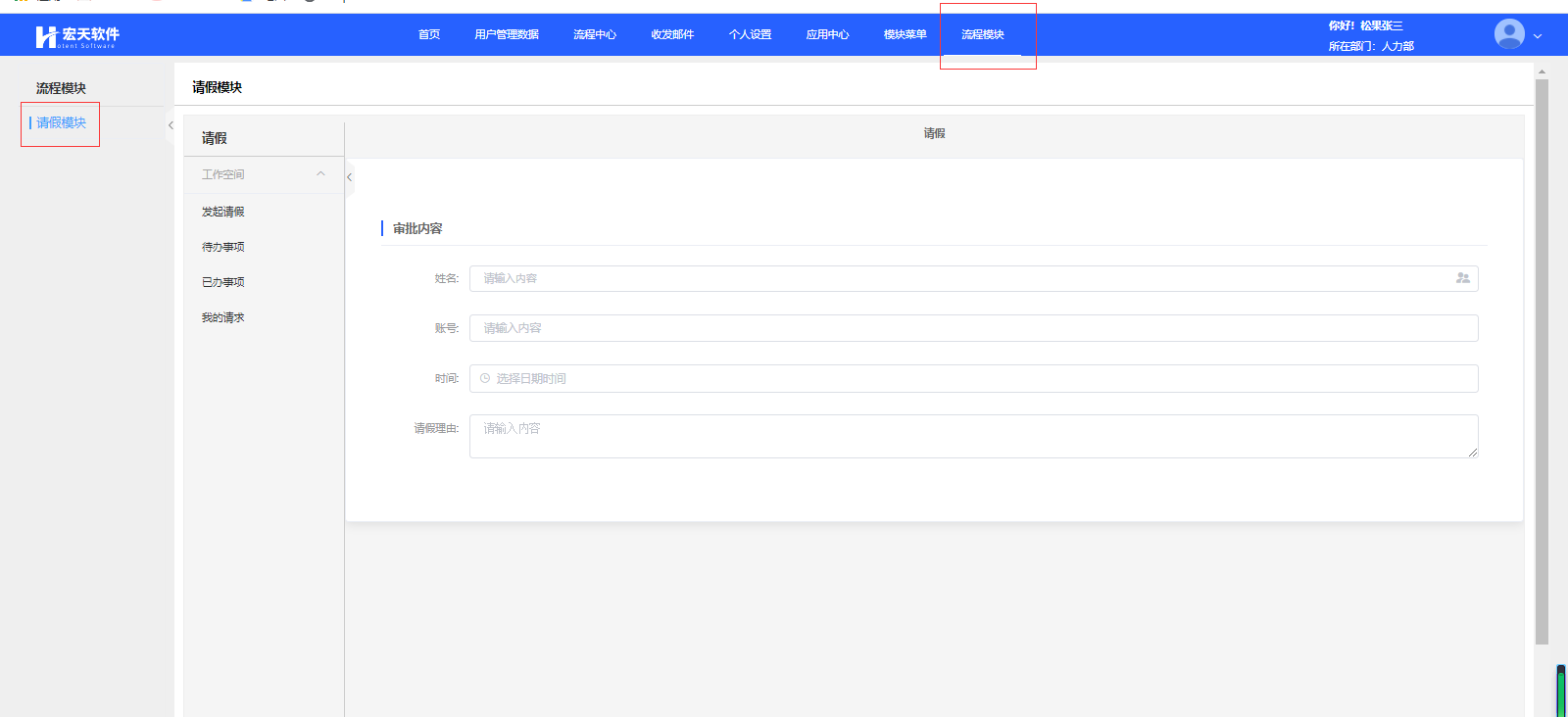 实现方案:配置一个流程模块,绑定请假流程,配置一个工作空间,可以发起请假流程,查看代办、已办以及我的请求,并且代办已办我的请求配置为已列表形式展示,最后将这个模块发布到应用端上;