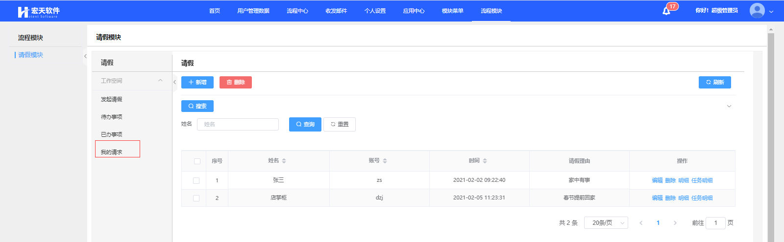 使用场景:发布一个流程模块到应用端菜单,用户通过这个流程模块可以查看自己发起的请假流程状况,并且可以列表形式展示处理情况;