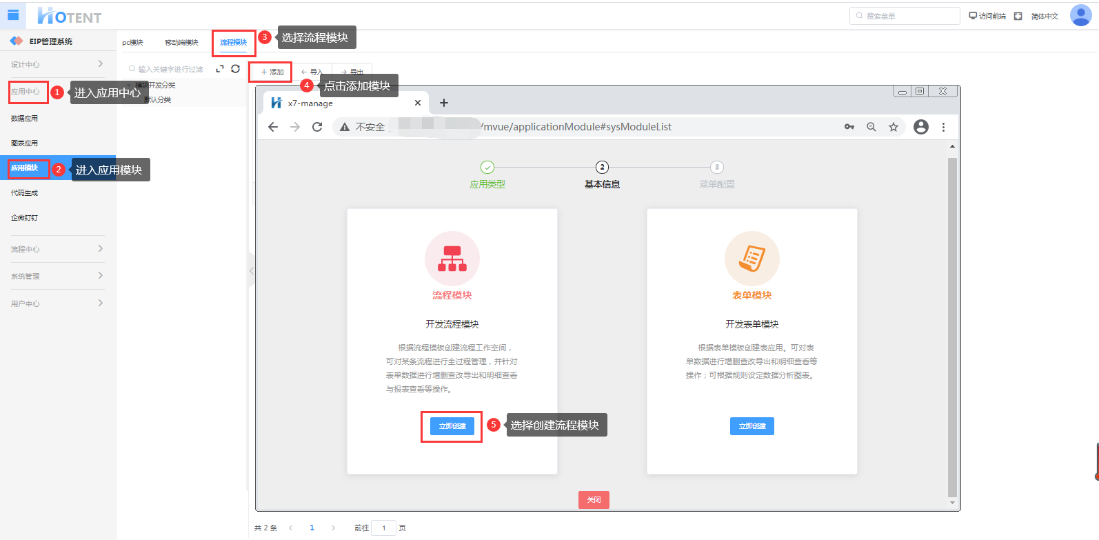 第一步:进入【应用中心】→【应用模块】→【流程模块】;