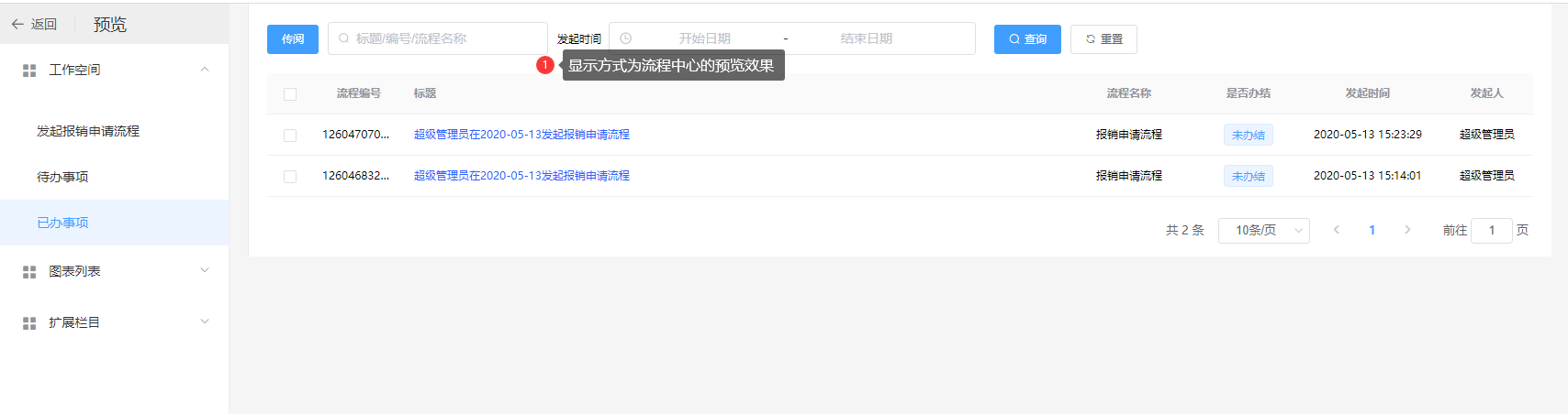 显示方式包括:流程中心、报表;如下图: