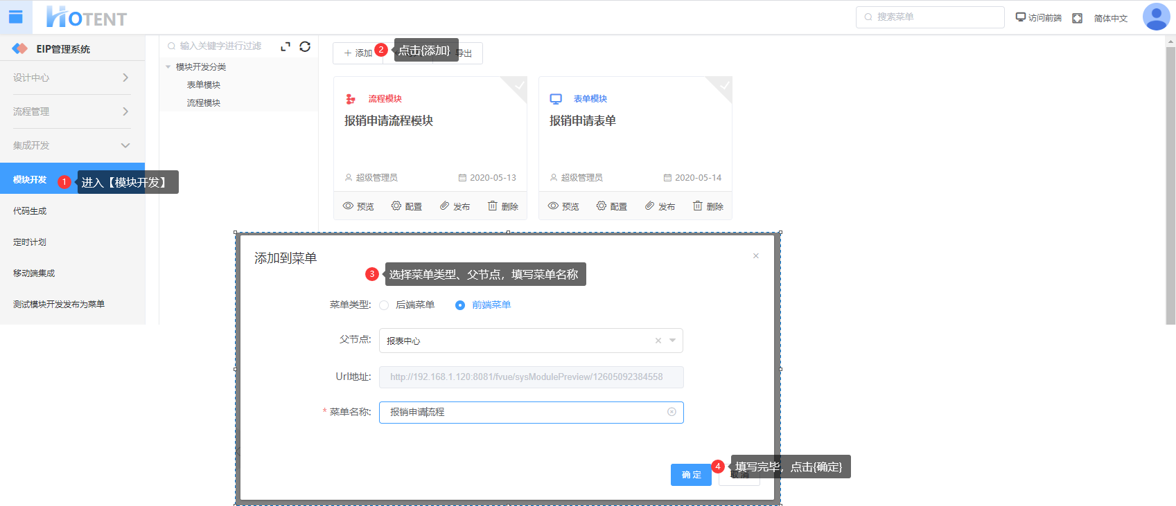 即将模块发布为前端或后端菜单,操作步骤如下: