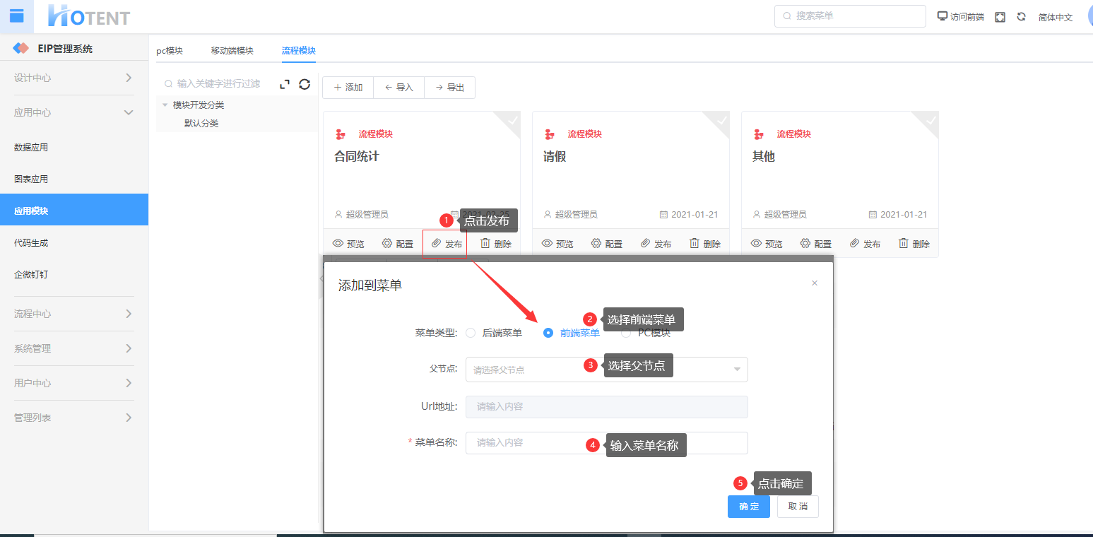 第二步:新增一个菜单”流程模块“,将流程模块发布到这个菜单上,点击确定完成发布