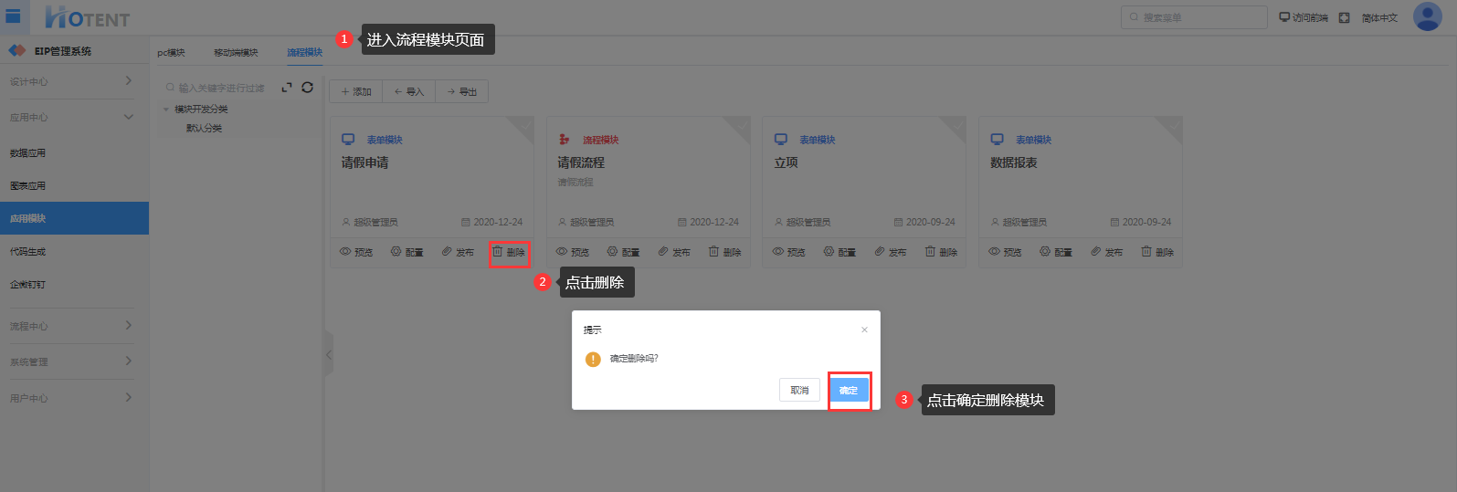 注:若该模块已发布为菜单,删除该模块配置后,在对应的菜单中打开该模块会报错;