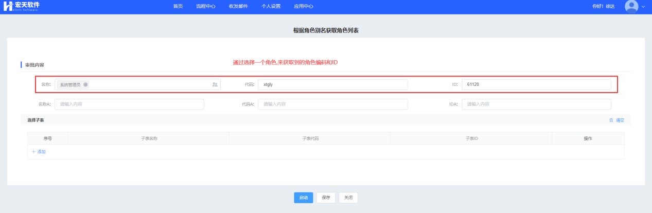 选择的这个字段可以不显示在表单中,但是在建模中一定要有该字段,表单配置中通过选择器,获取到角色的别名
