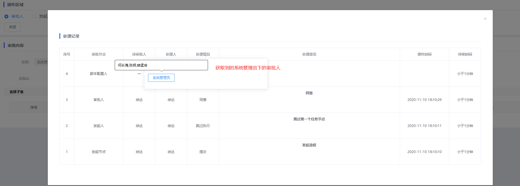 行政维度下张三处理后,获取到的审批人为李明,董倩,蔡强