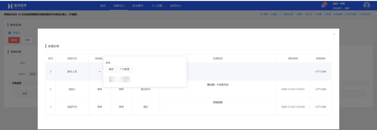 如上图,若选择的是广州公司,获取的实际结果应该是此组织上级即集团下人员列表中的主负责人,为董倩,或设置的是false则获取到的是李明,董倩,蔡强