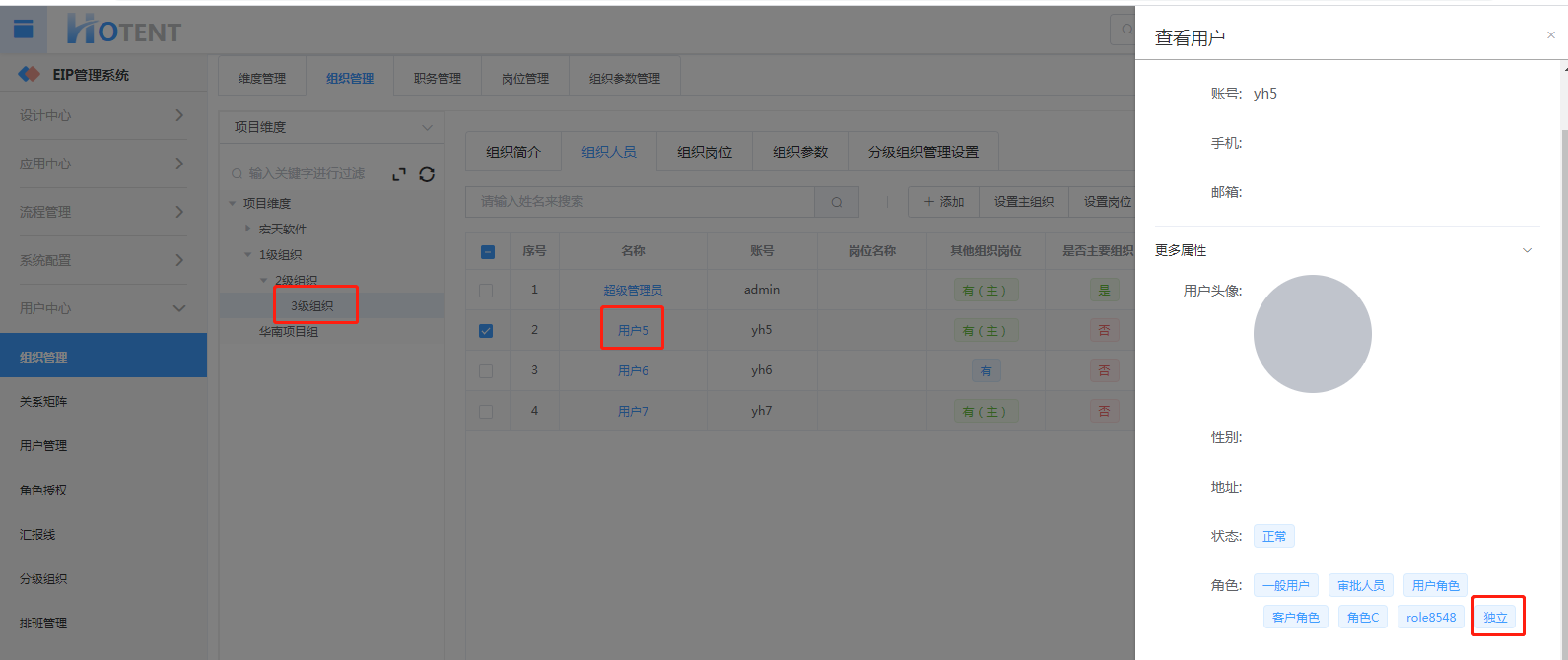 示例:用户5在1级组织下的子组织内,并且拥有“独立”的角色