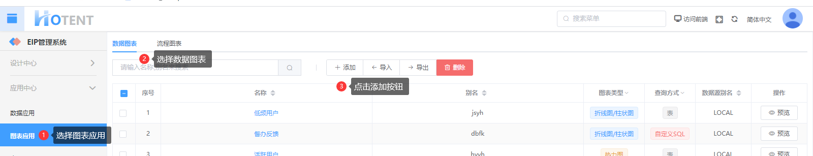 第一步:【应用中心】→【图表应用】→【数据图表】,单击“添加”;