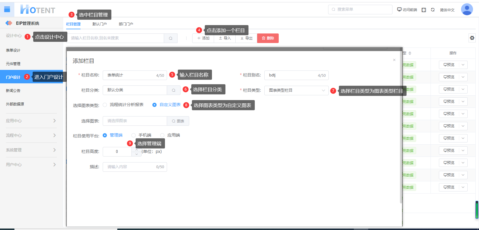 第六步:点击【设计中心】→【门户设计】→【栏目管理】,添加一个管理端的栏目用来展示这个饼图