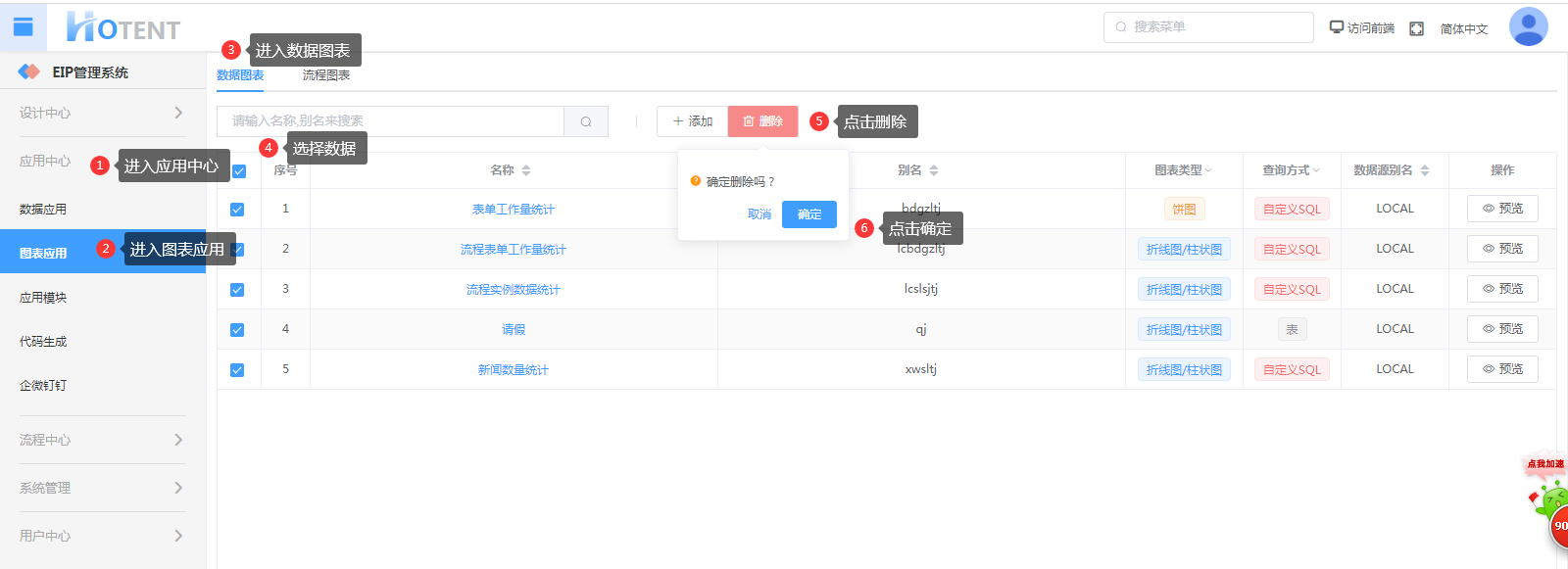 在图表管理页面,勾选要删除的图表(可多选),点击删除,如下图: