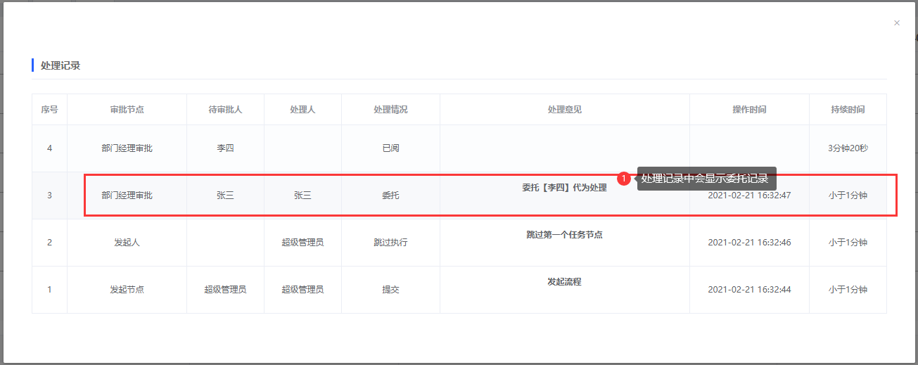 场景:将用户“张三”在2021-02-21 00:00:00到2021-02-22 23:59:59期间产生的所有待办委托给“李四”处理