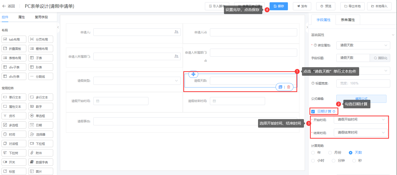 如:请假申请流程:根据请假开始时间与请假结束时间计算请假天数