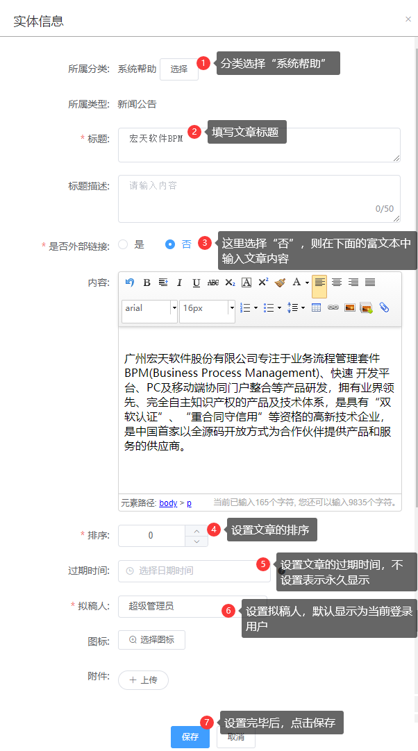 是否外部链接:是,需要输入对应的url链接(即显示外部链接内容);否,需要在下面的富文本中输入新闻内容;