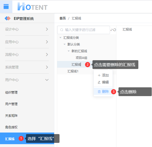 操作:【组织架构】→【汇报线】→单击选择汇报线分类→在右侧汇报线下点击 →单击“添加汇报线”→选择用户类型并选择对应类型后单击“保存”