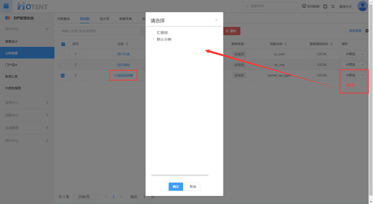 在系统初始化时,会在【元件管理】->【对话框】中初始化一个“汇报线选择器”对话框;