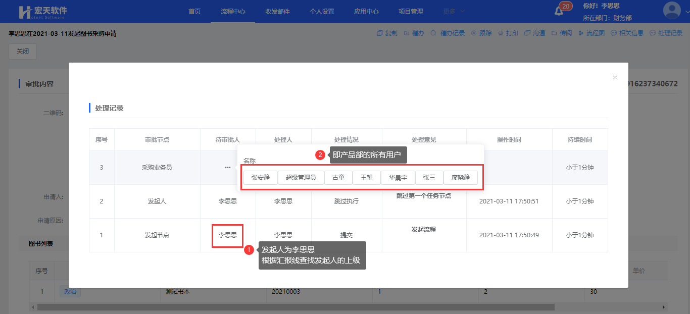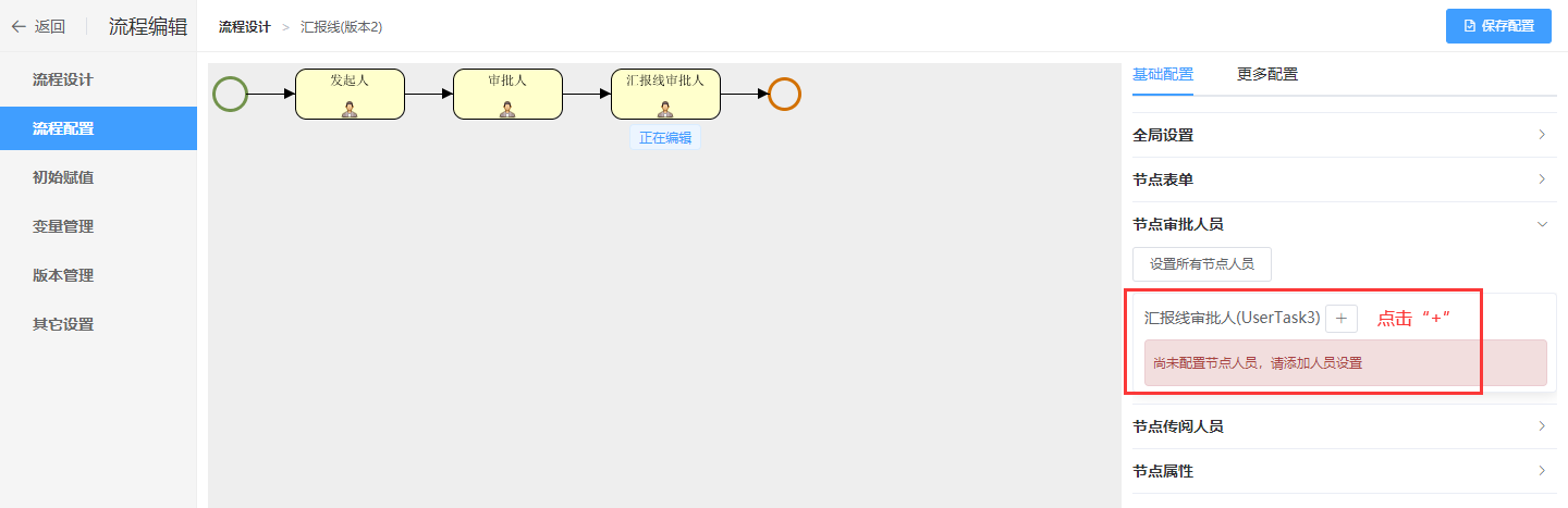第一步:进入流程设计页面,点击要配置人员的节点;