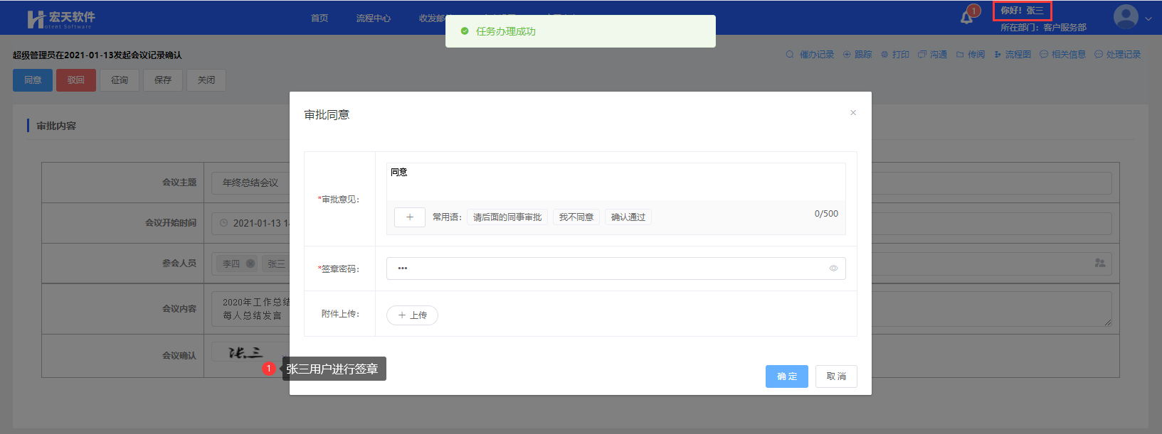 如下图:张三审批后,会议确认字段中显示的是“张三”的签章