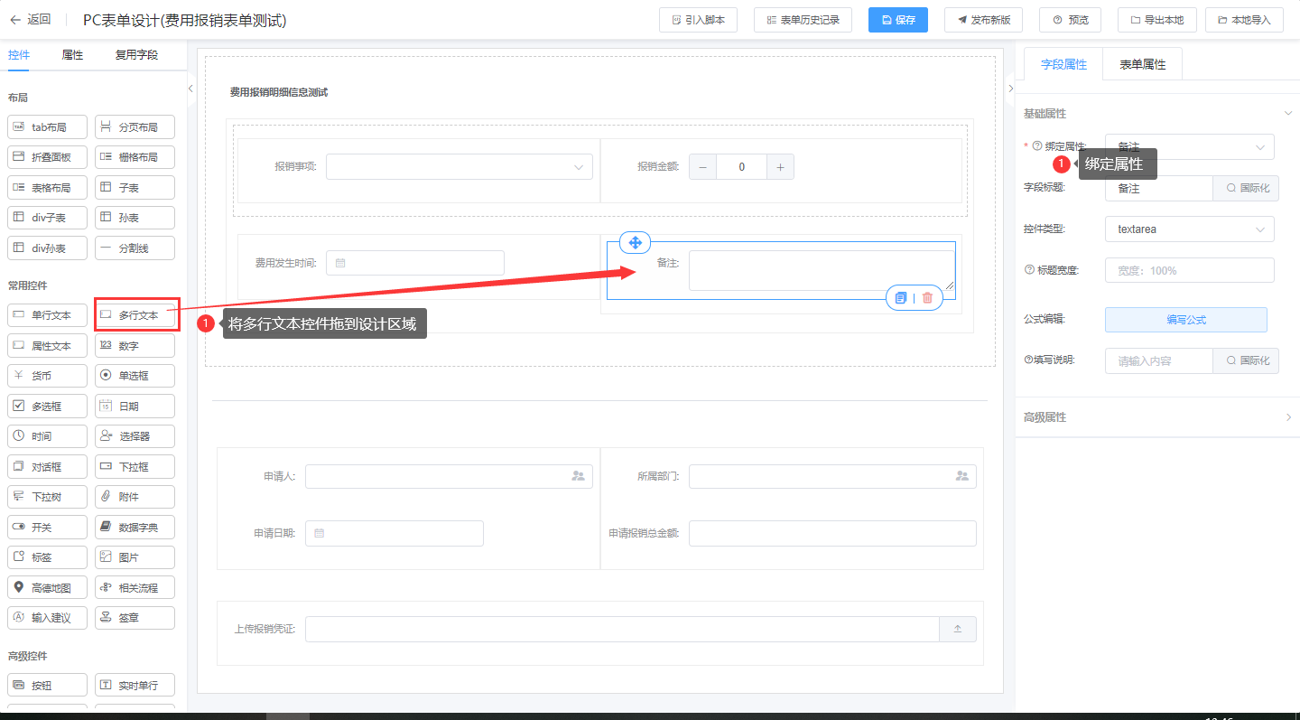 第一步:进入表单设计器页面,将多行文本拖拉到对应的栅格布局中;