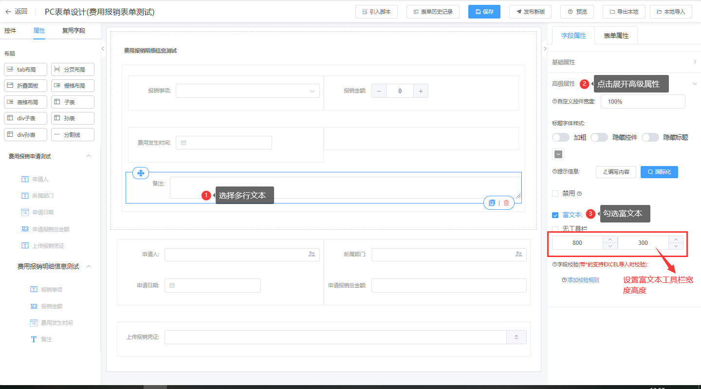 第三步:点击字段属性中的高级属性,勾选富文本并设置富文本控件的高度与宽度;
