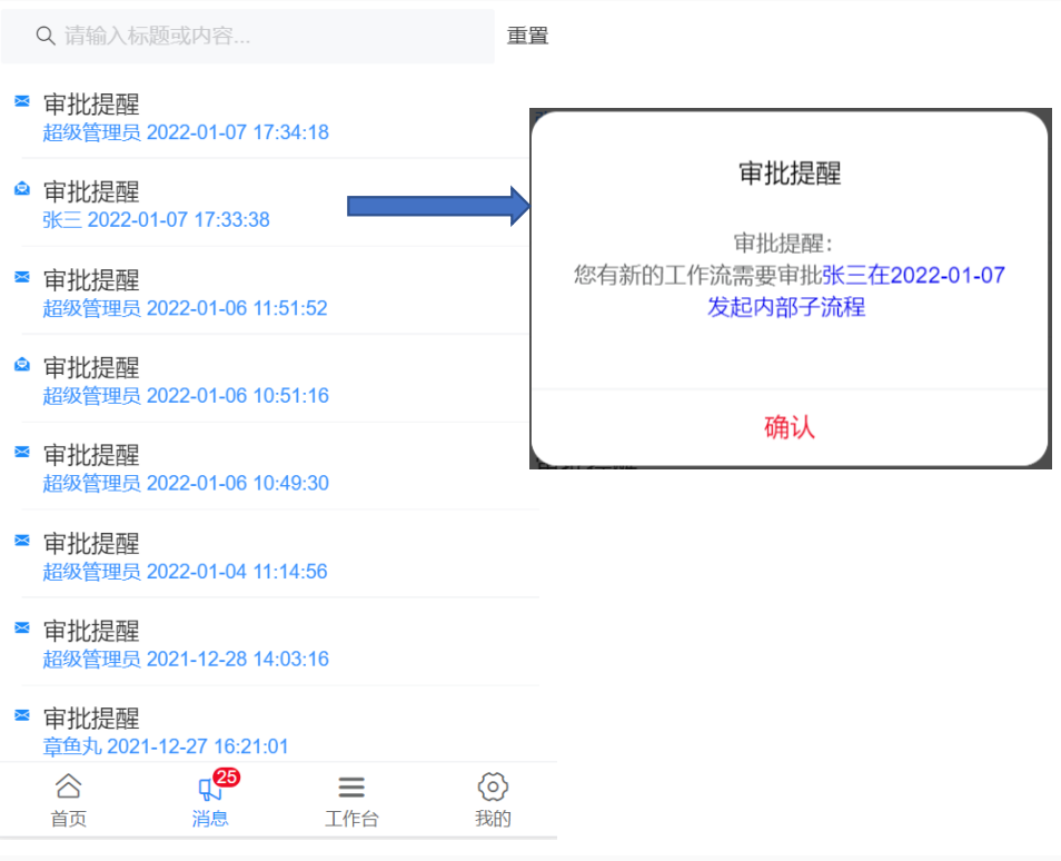 站内消息列表,点击标题可查看消息明细(与应用端的【内部消息】的数据保持一致);