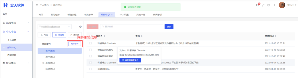 ② 邮箱配置添加成功后,便可进行收发邮件的操作