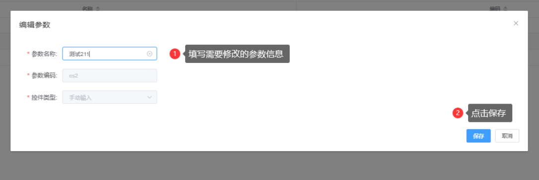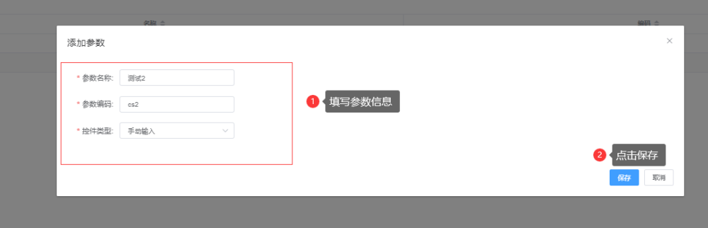 注:『添加参数』中字段“参数名称”、“参数编码”、“控件类型”均为必填。
