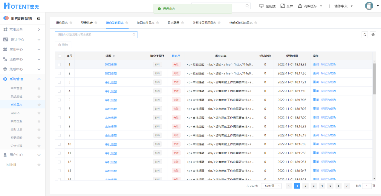 消息发送日志,有两状态:成功、失败。可通过“重调”以及“标记为成功“修改其状态。