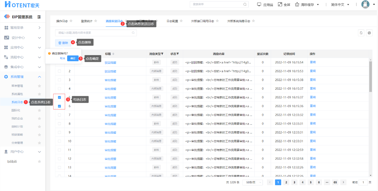 操作:【系统管理】→【系统日志】→【消息发送日志】→勾选需删除的日志→点击“删除