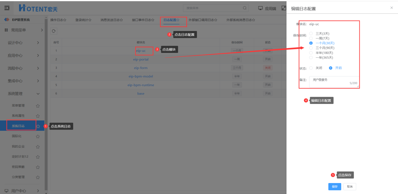 第一步:【系统管理】→【系统日志】→【日志配置】;
