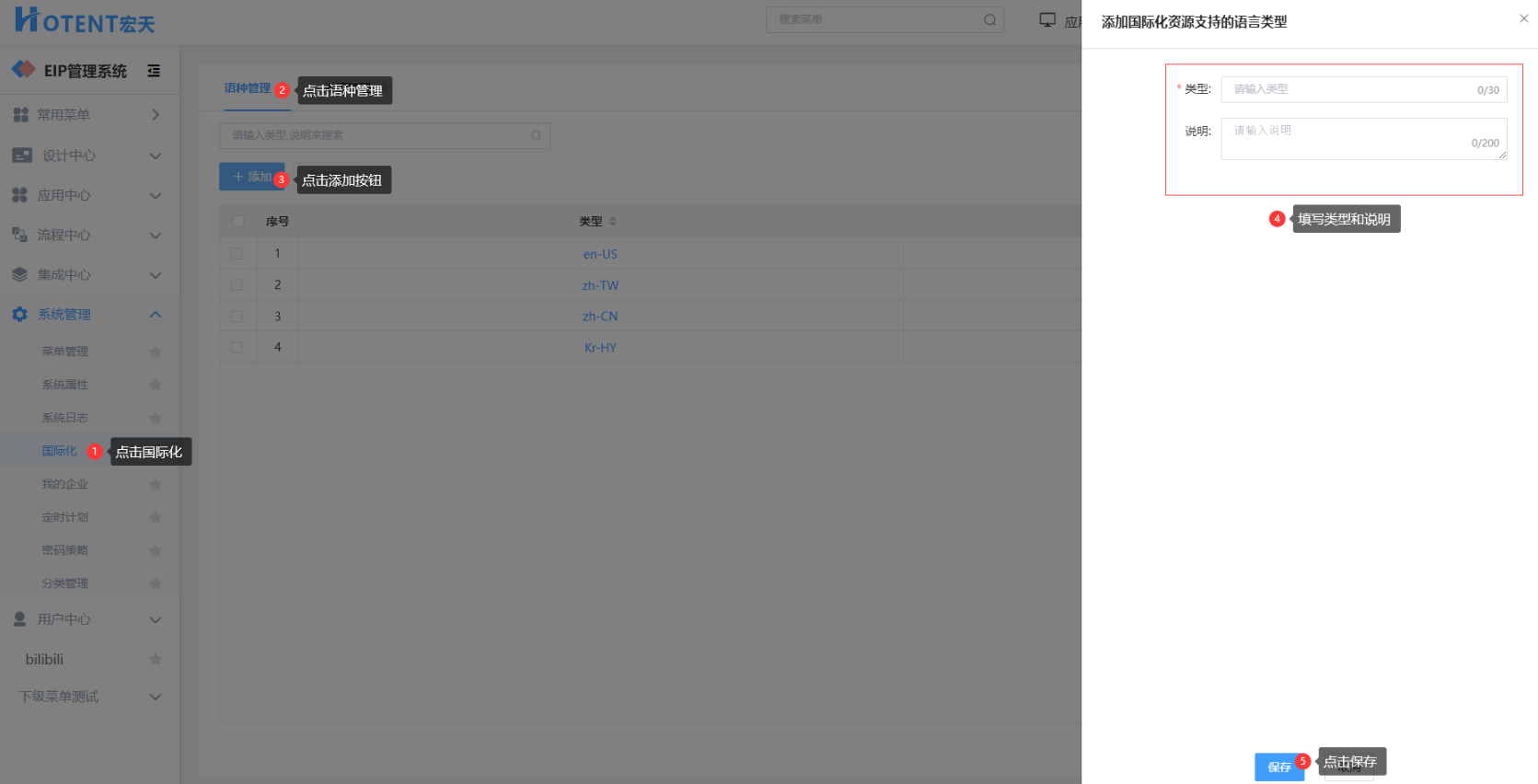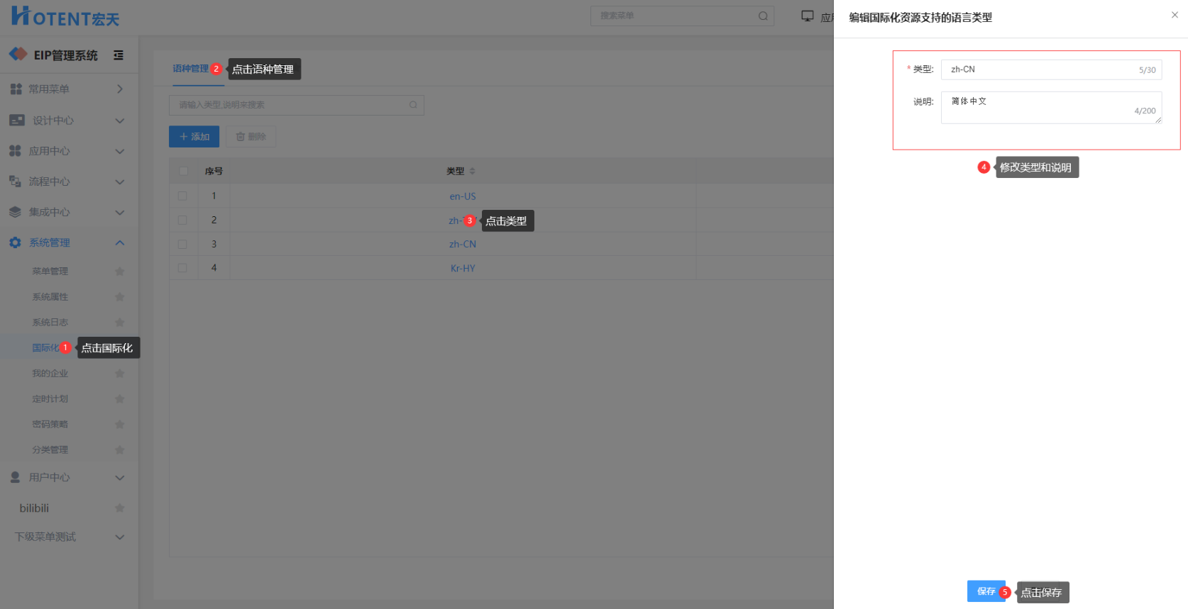 点击语种列表中的类型可进入语种编辑页面,可修改类型及说明。 操作如下: