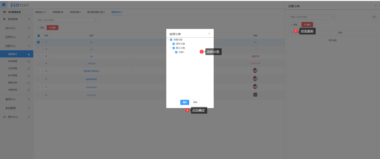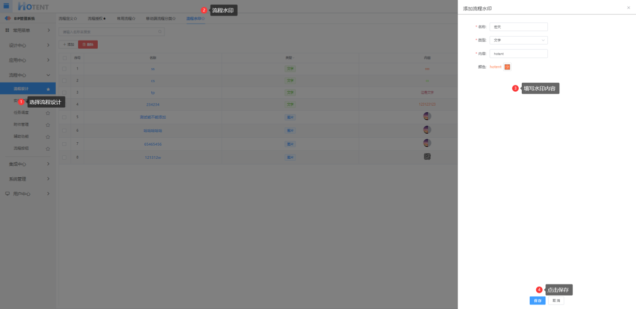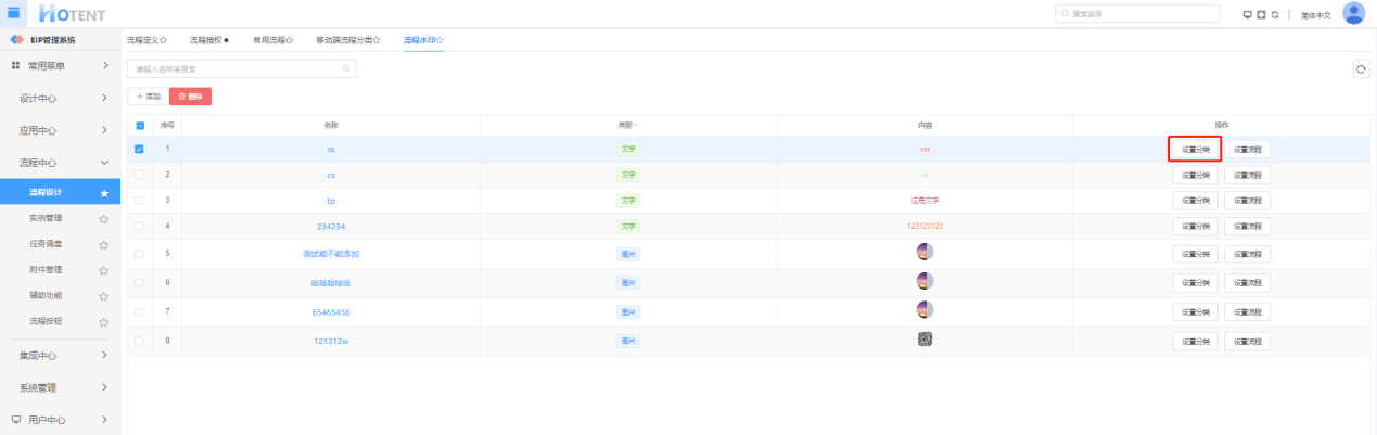 流程水印分类文字和图片两种效果,但是一条流程只能同时生效一种配置