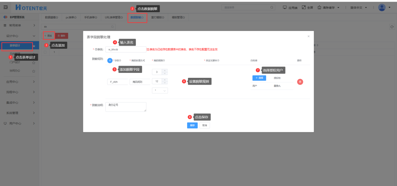 第三步:输入需要设置敏感处理的数据表名、表中的字段名称、掩码处理的方式、掩码规则等配置信息;