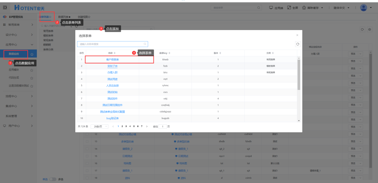 第一步:进入【表单列表】,将“客户信息表”添加为表单列表;