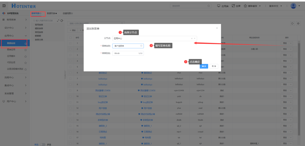 第二步:将“客户信息表”的表单页面,添加到前端菜单;