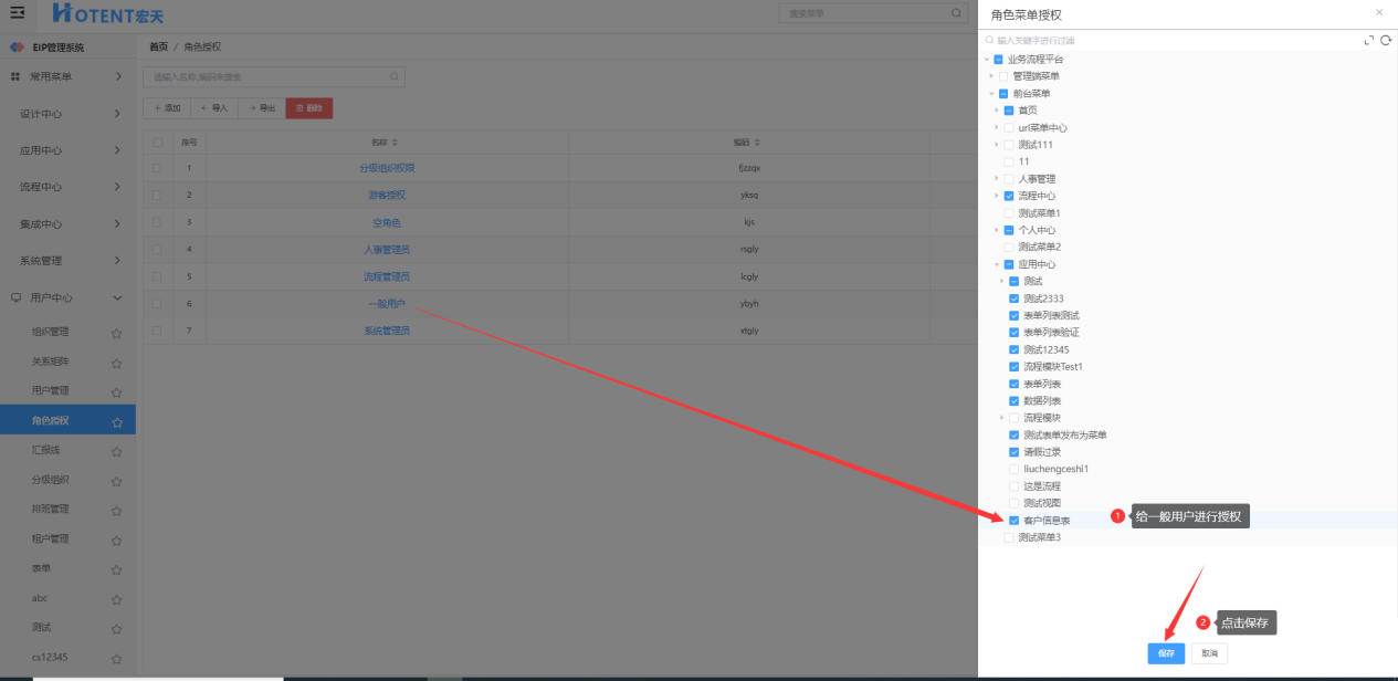第三步:进入【用户中心】-【角色授权】把这个菜单权限分配给角色“一般用户”;