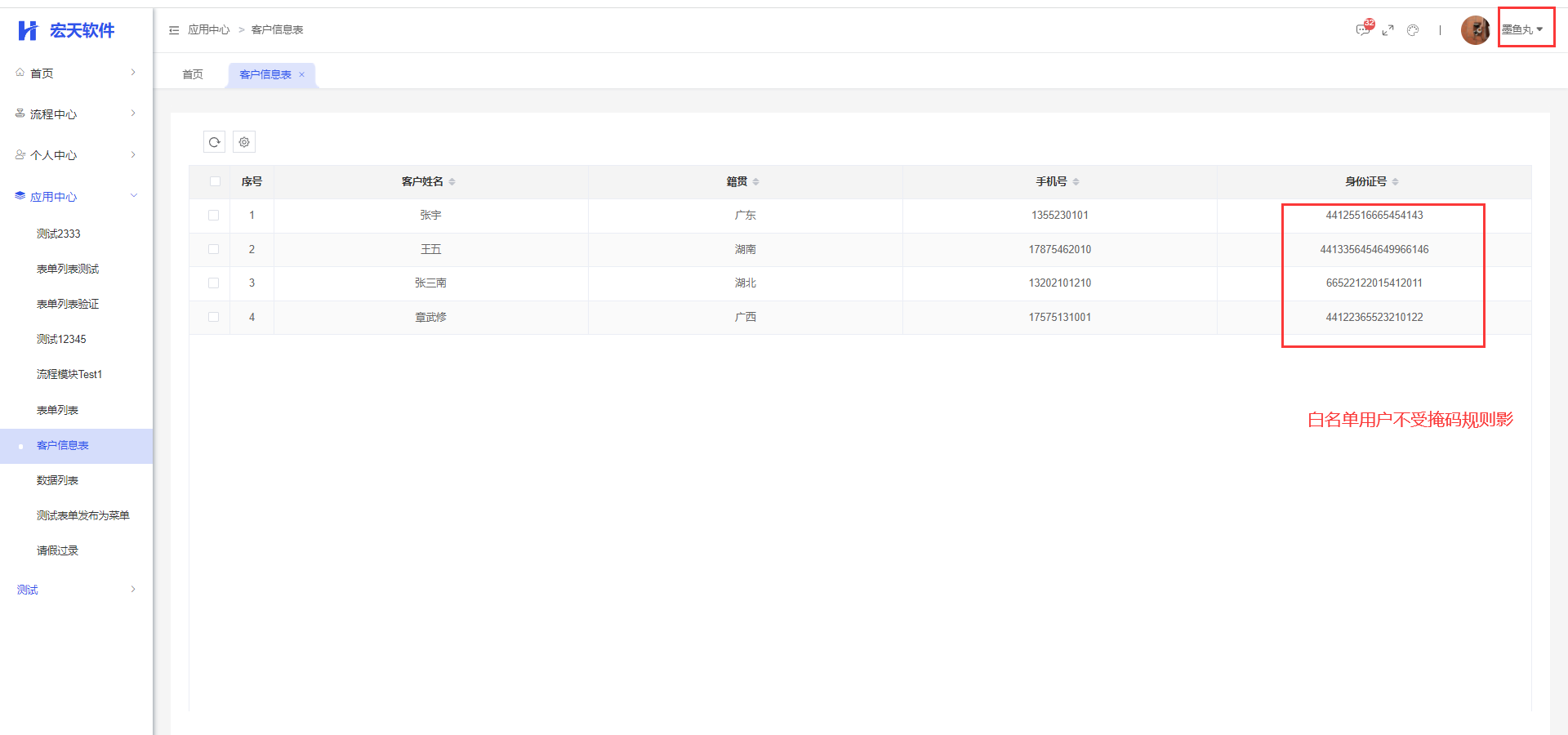 注:在流程中,不在数据脱敏中的白名单的用户,对“客户联系方式”这个字段进行修改是不生效的