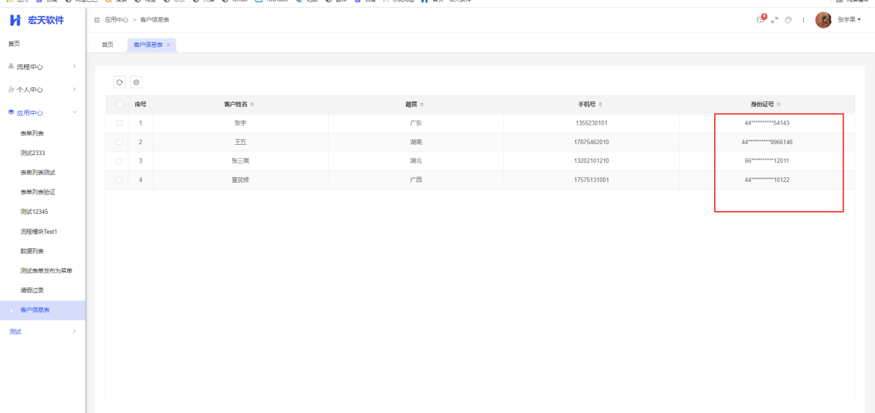 一般用户“张宇”登录应用端,查看“客户信息”列表: