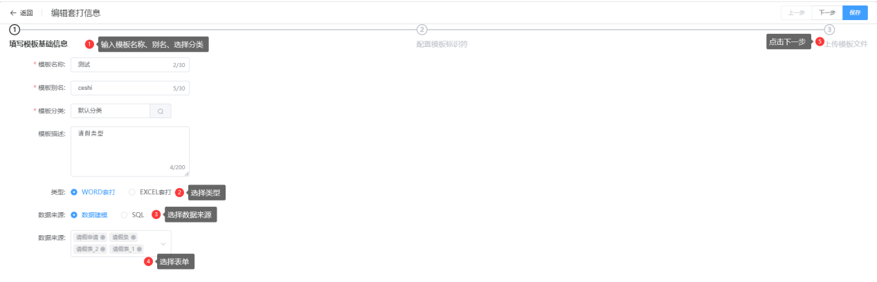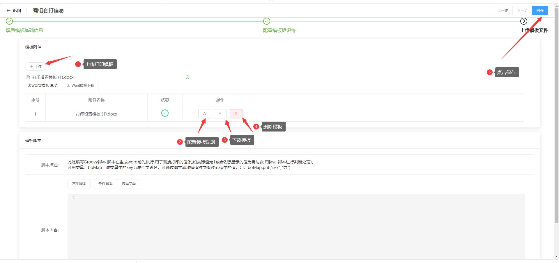 第四步:上传打印模板(模板具体设置请看【表单设计】-【PC表单】设置套打模板操作),设置模板规则等,点击保存