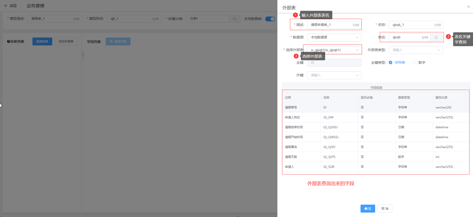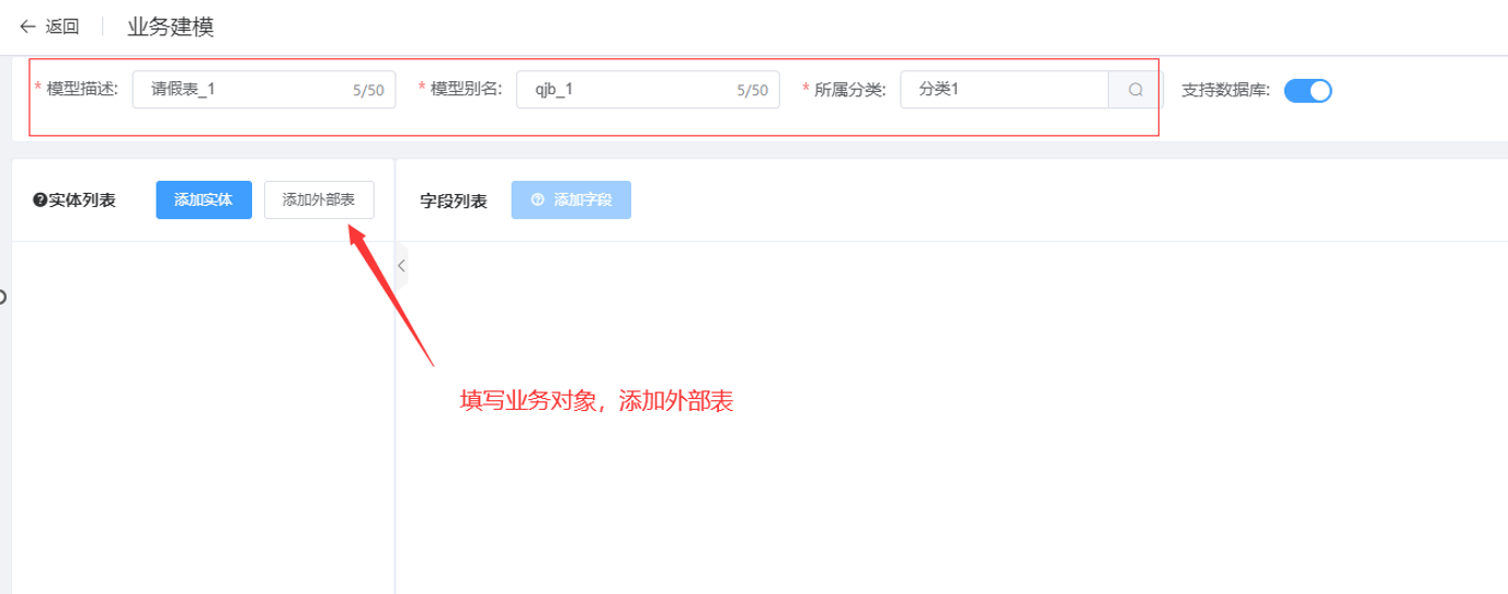 第三步:在新增建模页面中填写业务对象信息后,点击“添加外部表”按钮;