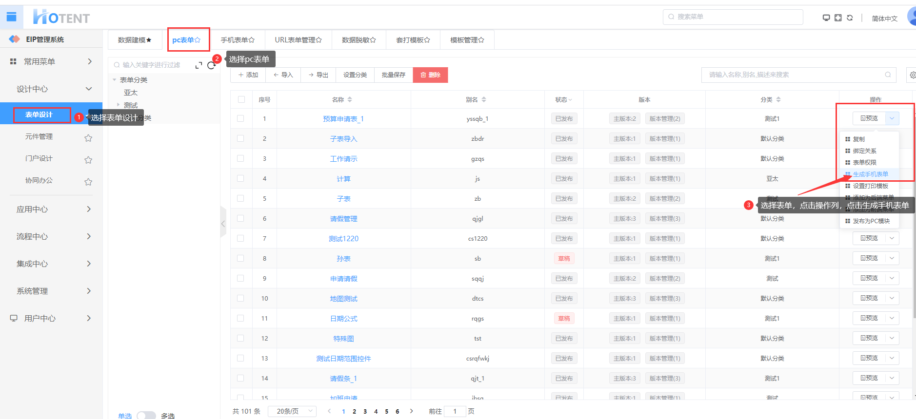 第一步:【设计中心】→【表单设计】→【PC表单】,选择数据,点击表单的操作列下的“生成手机表单”;