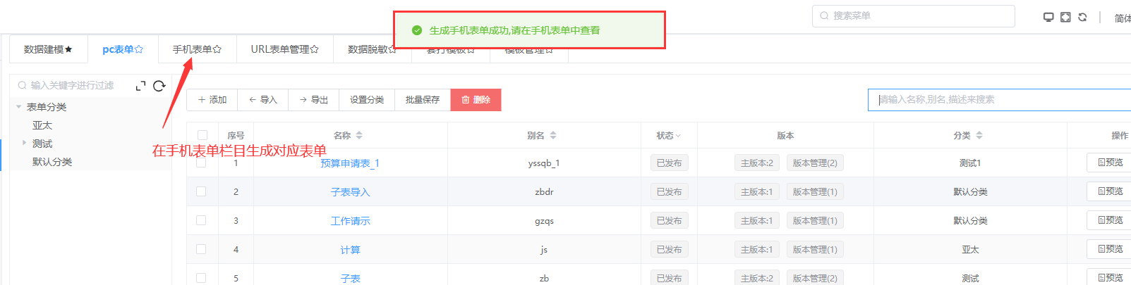 将设置好的pc端表单快速生成手机端表单,生成的手机端表单可在手机表单列表查看并修改;