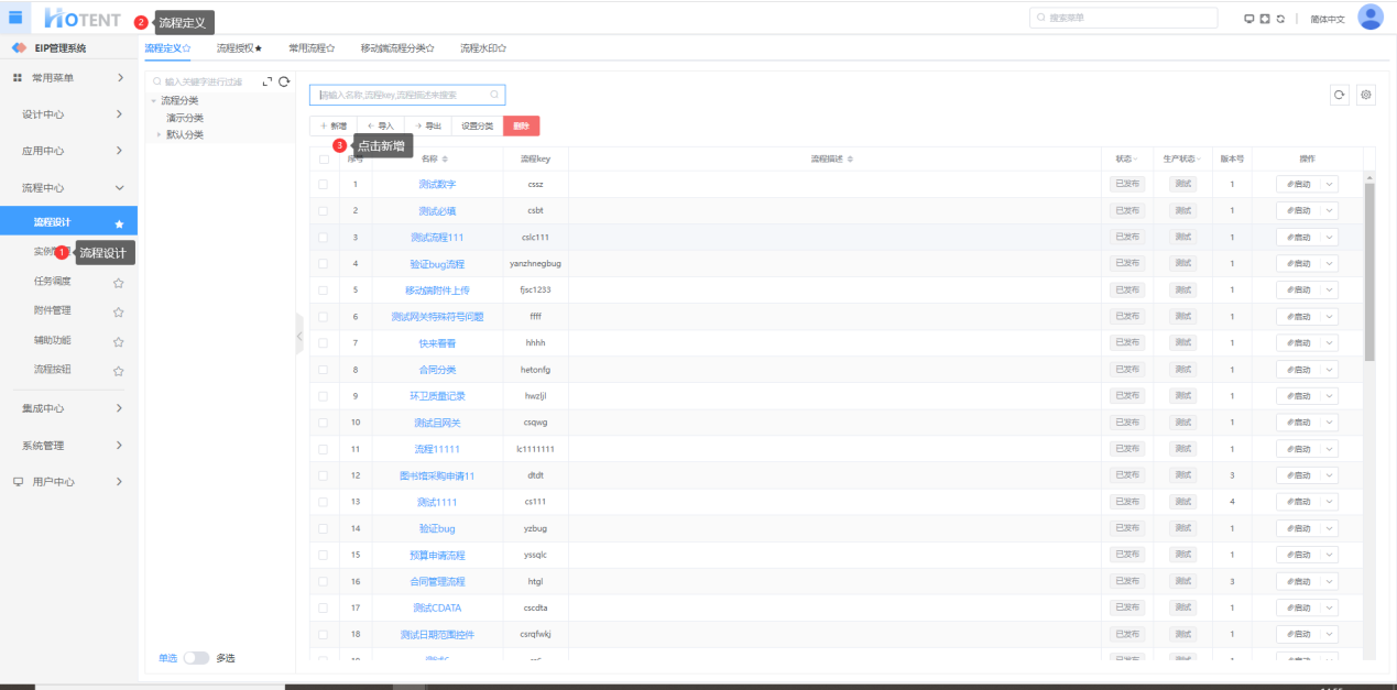 在流程列表页面中显示用户自己添加的有查看流程定义权限的流程,除了超级管理员。超级管理员有所有流程的查看和其他操作权限,流程的权限分配请参考分管授权。在流程列表页面中进行的操作有:1.流程图的设计2.配置流程表单、节点人员的设置3.流程节点、插件配置 4.流程的其他设置。