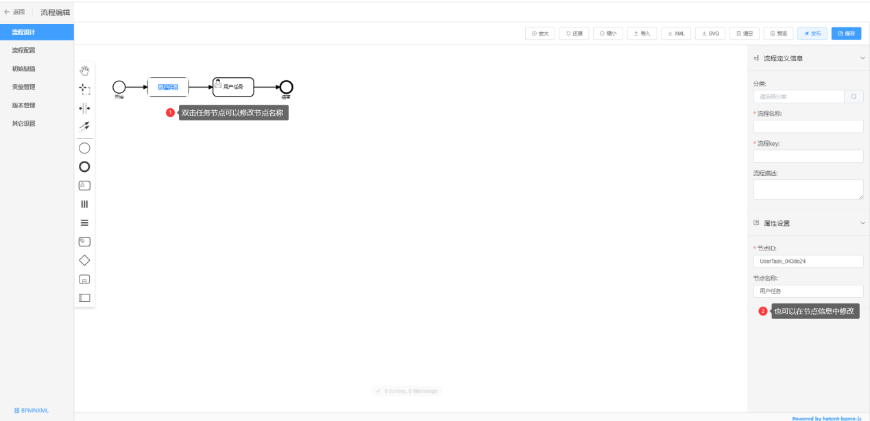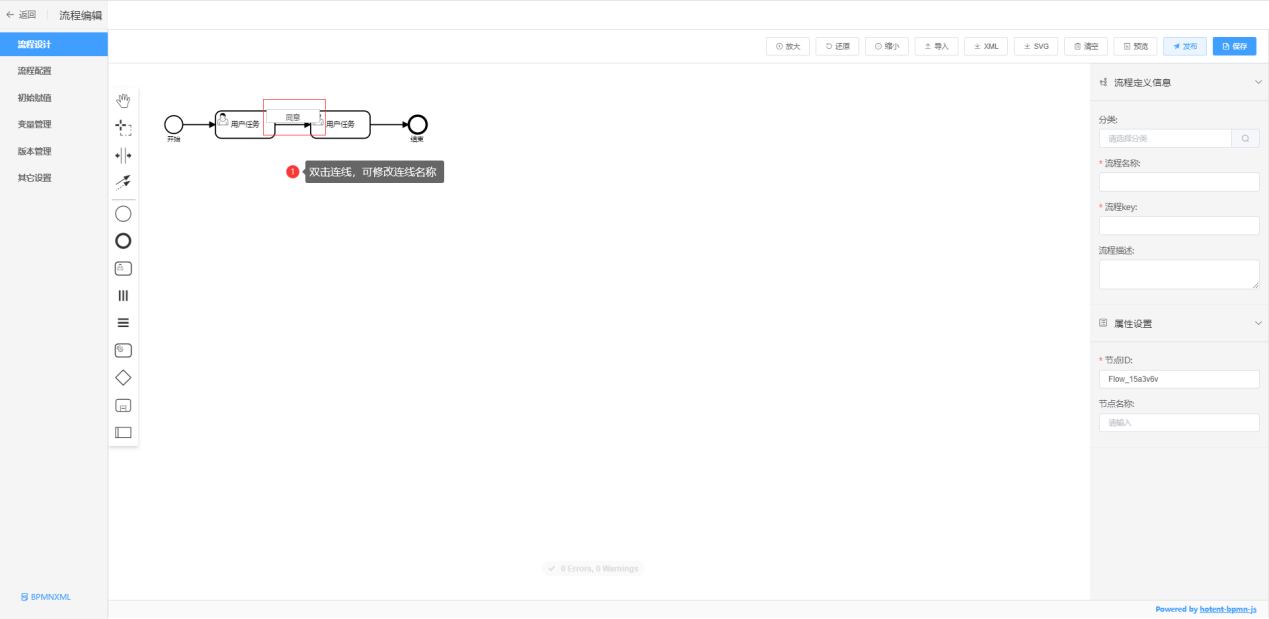 将左边的流程图元素拖到流程图编辑区域设计成符合自己需要的流程图,双击流程图元素和连线,修改元素和连线的名称,元素也可以称为节点,也可以在页面右边的【节点信息】中修改节点和连线名称,如下所示: