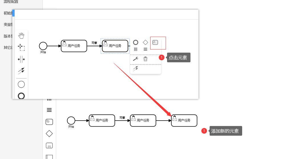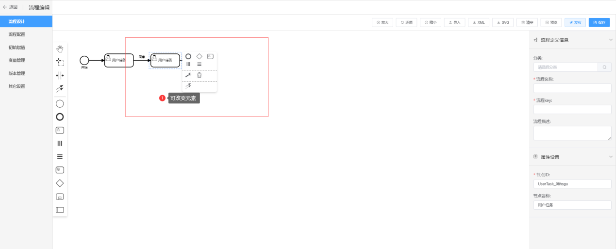 注:改变元素类型时,只能变为相似的元素类型,例如,开始节点只能变为结束节点,用户任务只能变为其他任务,不能变为开始和结束节点,网关只能变为其他类型的网关。