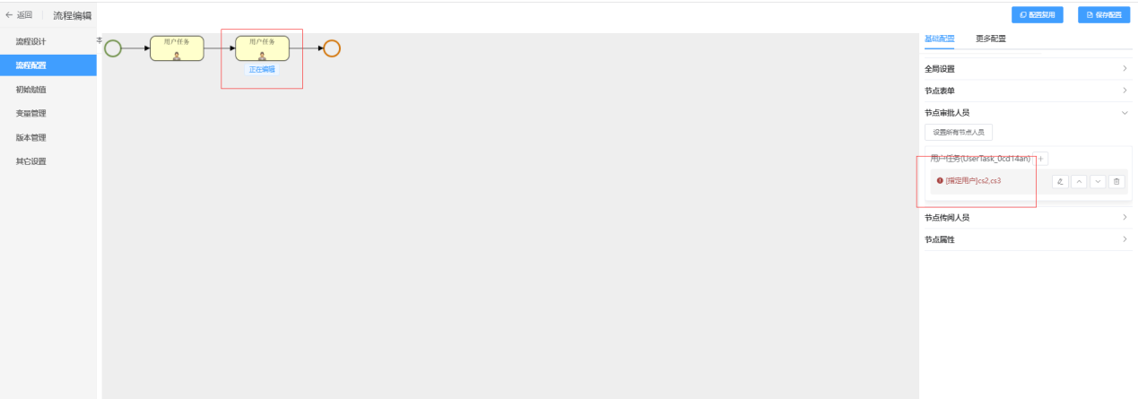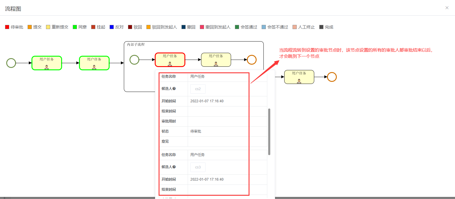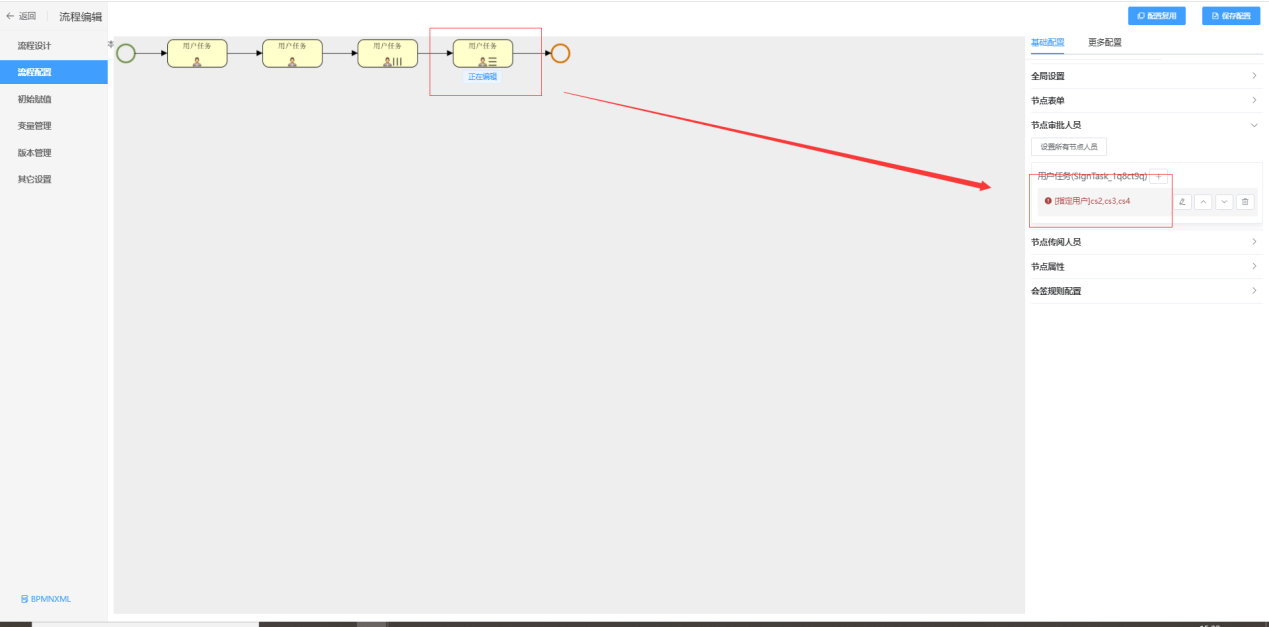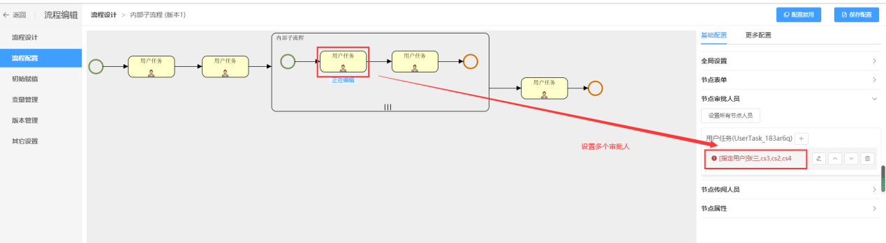 在内部子流程的第一个节点设置四个审批人分别是:张三,cs3,cs2,cs4