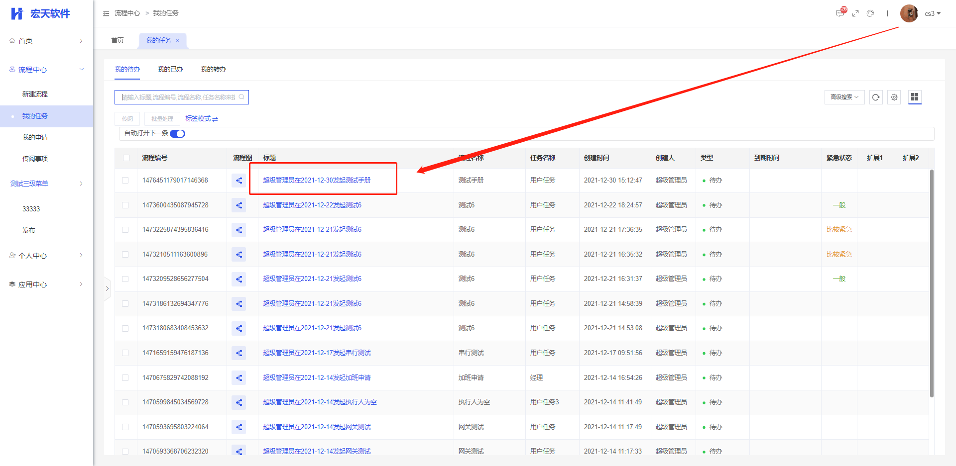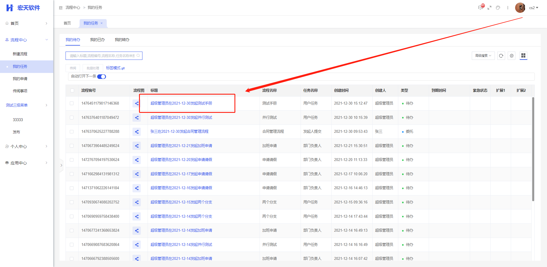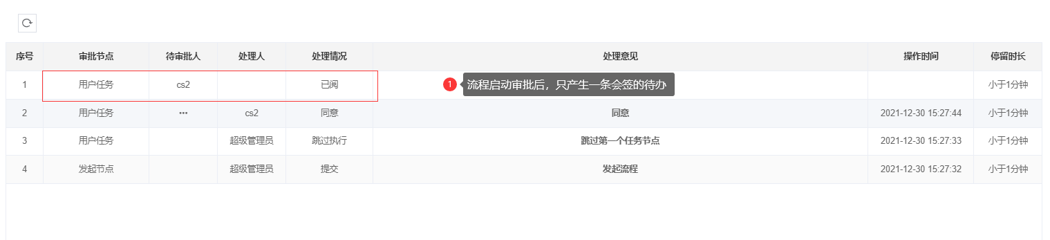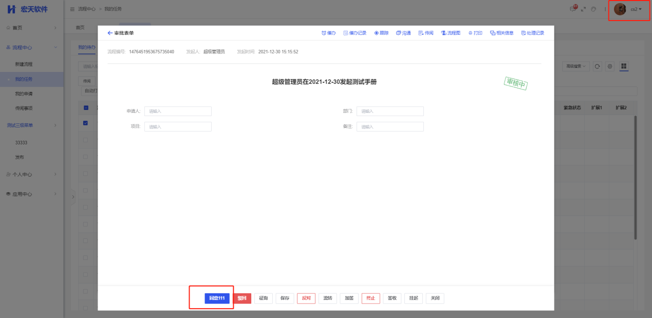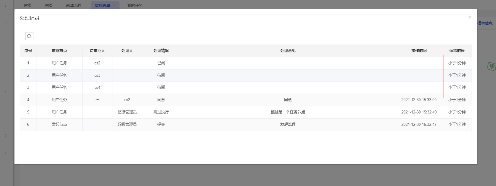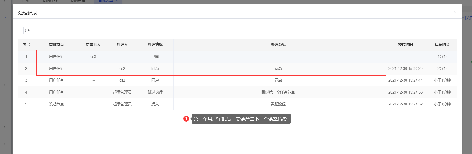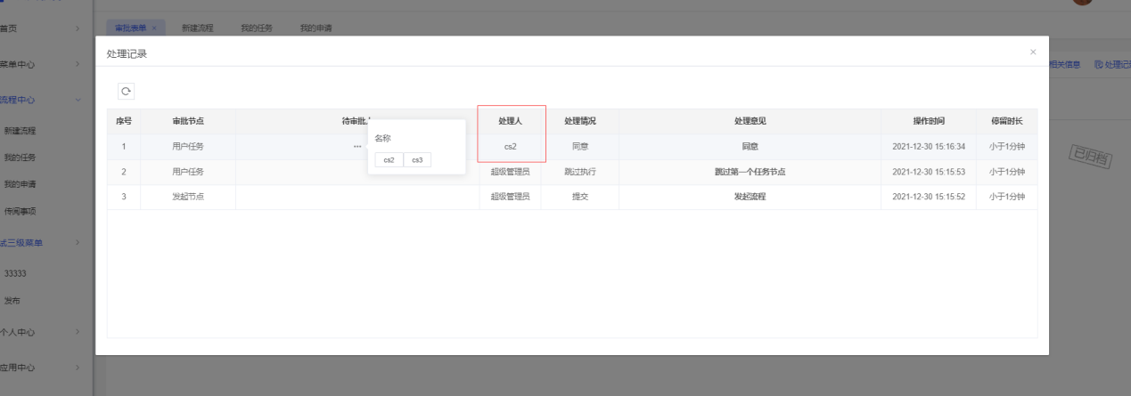 使用“CS2”的账号进行审批后,则“CS2”为部门经理审批环节的处理人,另外一个个用户的待办会在对应的待办列表上消失;