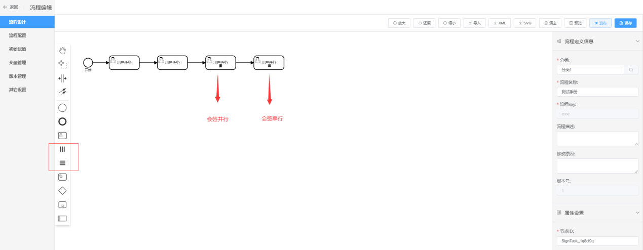 会签节点有串行和并行两种类型,这里的串并行指的是会签节点产生任务时,任务是以串行或者以并行的方式产生。例如给会签节点设置了三个节点人员,串并行类型选择串行时,会签节点的任务是先产生一个,这个任务被处理后再产生另一个;串并行类型选择并行时,会签节点的这三个任务同时产生。下面举例说明。
