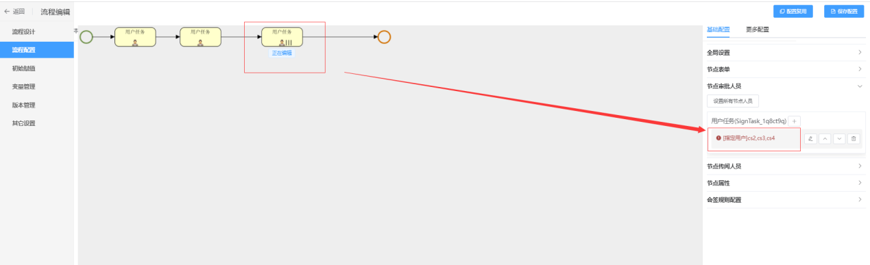 在下面这个流程中,会签节点的串并行类型选择的是“串行”,会签节点的审批人员设置了三个,如下图所示: